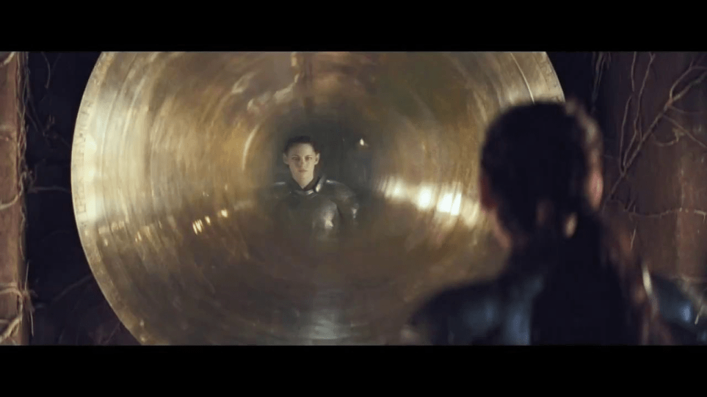Le miroir est l’objet par excellence qui fait basculer l’histoire de Blanche Neige dans la magie. Il est ici repris et mis au centre d’une nouvelle intrigue, celle de la Reine des Glaces, Freya – prénom de la Reine des dieux dans la mythologie nordique – ici petite soeur de Ravena, la méchante sorcière qui cherche à faire assassiner Blanche Neige dans l’histoire originele. Le lien entre les deux magiciennes est une invention pure des scénaristes, assez déconcertante au premier abord, mais qui fonctionne finalement très bien, et permet de déclencher une rivalité sororale donnant au film l’un de ses principaux ressorts tragique.