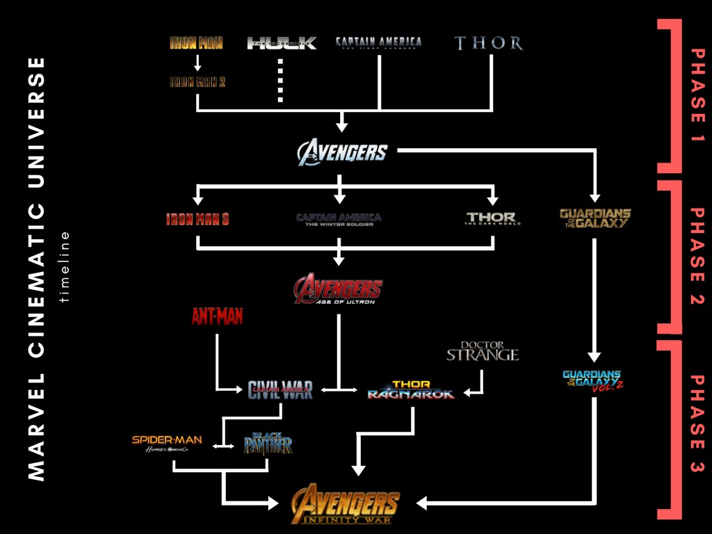 A proprement parler, les films Avengers sont au nombre de trois: Avengers, L’ère d’Ultron et Infinity wars, en deux parties. Ces trois films où l’équipe se rassemble constituent les sommets des phases respectives du MCU.