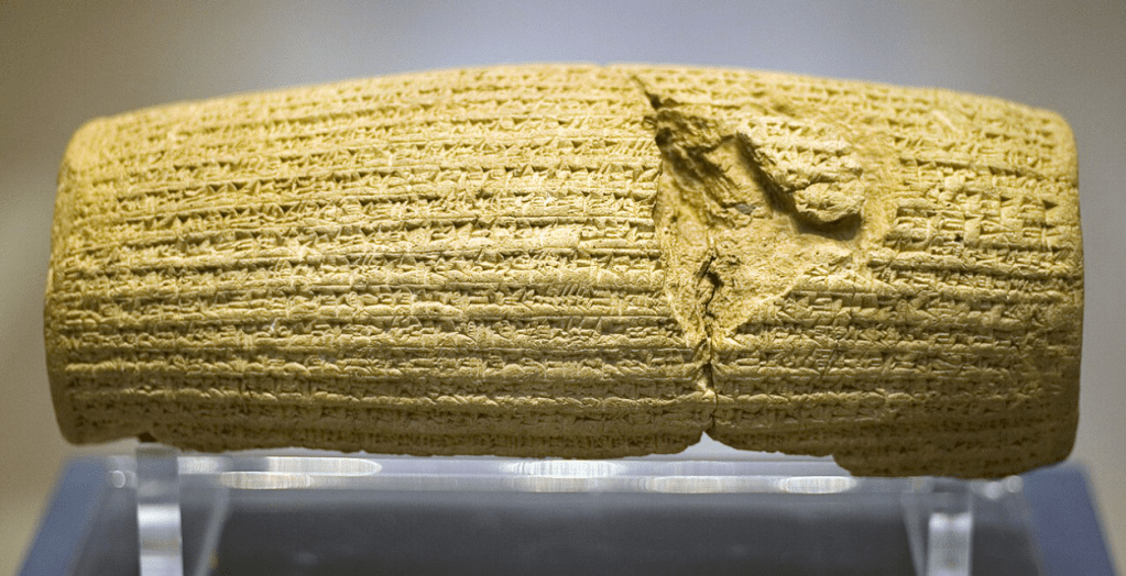 Cyrus II, dit Cyrus le Grand, fondateur de l’Empire Perse, met à bas l’empire des des Mèdes et Babylone et libère les juifs de leur captivité. Après cette libération, il édicta son célèbre décret, considérée comme la première charte des droits de l’homme de l’histoire, qui accordait à tous les peuples de l’Empire une liberté totale de croyance, langue et coutumes « J’ai accordé à tous les hommes la liberté d’adorer leures propres dieux et ordonné que personne n’ait le droit de les maltraiter pour cela (…). J’ai garanti la paix, la tranquillité à tous les hommes. J’ai reconnu le droit de chacun à vivre en paix dans le pays de son choix… ».