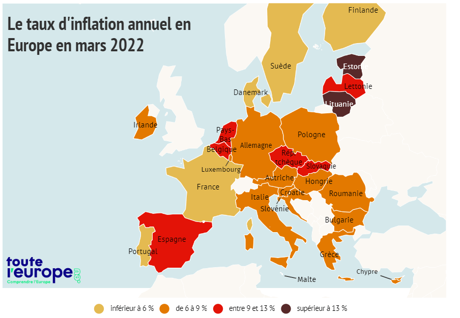 Une double cerise sur le gâteau financier vient compléter ce tableau. Premièrement la charge des intérêts de la dette va augmenter dès que les taux d’intérêt vont augmenter. Tout risque bien d’arriver en même temps: la récession, la hausse des taux d’intérêt, le maintient de l’inflation importée et due à la guerre… Secondement, l’Euro rendu trop abondant dévisse pour la première fois de sa courte histoire et rejoint la parité avec le dollar. C’est toute l’économique européenne qui s’enfonce, renchérissant toutes les importations en dollars, qui restent très importantes.