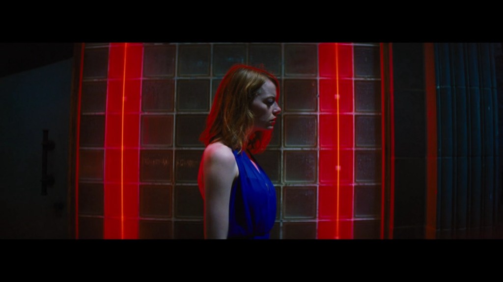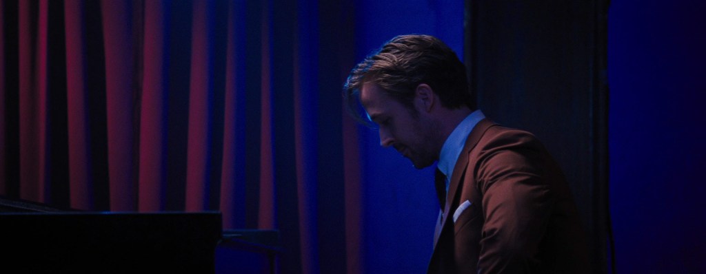 Mia est une jeune actrice en devenir. Sebastian est un pianiste amoureux du jazz. Ils connaissent tous les deux les galères des commencements. La narration mêle habillement leurs deux histoires, sans même que le spectateur ne s’en aperçoive. Ils se croisent en voiture lors de la scène d’ouverture. Mia est en train de répéter une scène pour un casting. C’est d’abord son parcours que nous suivons. Serveuse dans le bar d’un grand studio, elle passe de casting en casting sans réussir à décrocher un rôle. Revenant d’une soirée, elle tombe sous le charme d’une mélodie qu’elle entend dans un bar. Elle s’arrête entre deux néons rouges qui figure l’envoutement. Elle tombe amoureuse de la musique, avant même de voir Sebastian qui est en train de l’interpréter.