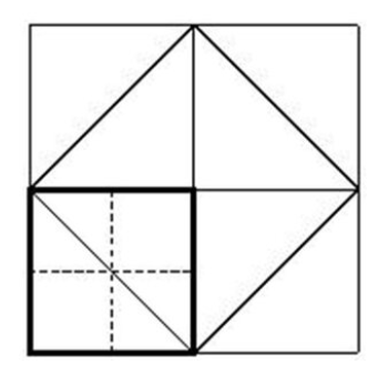 On peut ainsi calculer l’air du carré inscrit, qui est de 16 pieds, divisé par deux, soit 8 pieds carrés, soit la moitié de l’air du grand carré. Mais comment trouver cette grandeur arithmétiquement, qui multipliée par elle-même fera 8 pieds carrés ? En terme moderne, on cherche x pour x^2=8. Il sera compris entre 2, 2*2=4 et 3, 3*3=9. Il sera d’ailleurs plus proche de 3. Or 8=2*2*2, ce qui décomposé nous donne comme longueur du côté : 2*racine de 2. (2*2 est simplifié, la racine de 2^2 étant de 2, il reste uniquement une racine de 2 à trouver). Or on peut remarquer que 2 est la longueur du côté du premier carré dont on cherche la longueur de la diagonale. On peut généraliser ce calcul à tous les carrés (il suffit de partir d’un côté de 1 pied de côté – nous épargnons la généralisation au lecteur), de sorte que la formule générale est toujours : longueur du côté du carré *racine de 2, ou a racine de 2 en langage moderne. Nous savons que ce nombre est la racine de 8, que l’on peut arrondir à 2.83.