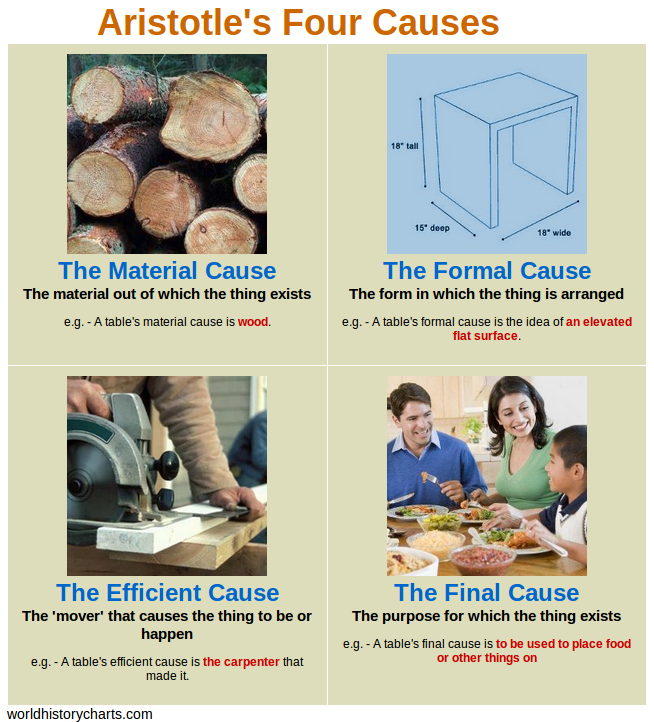 Aristote pose en effet son analyse des causes dans le cadre de la compréhension de la technique. C’est un point que l’on oublie trop souvent. L’artisan est celui qui utilise pour ainsi dire les 4 causes pour créer quelque chose. Il part d’une matière (ulé, hylé), cause matérielle. Il la transforme par la cause efficiente, mécanique, pour lui donner la forme, ou idée qu’il a en tête, cause formelle. Son travail a pour but (télé) de créer un objet, et c’est la cause finale ou téléologique.