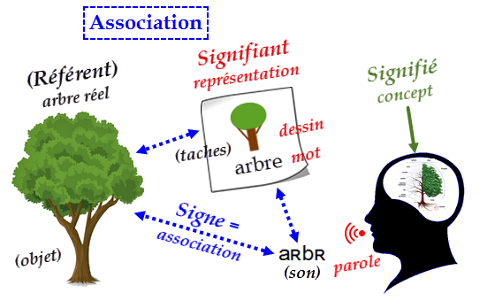 En langage linguistique moderne nous pourrions dire (attention, nous posons ici des définitions qui ne sont pas exactement celle du fondateur de la linguistique, Saussure) que la réalité désignée est le signifié. Le mot utilisé pour dire est le signe. Et le concept de la réalité qui est pensée par le signe est le signifiant.