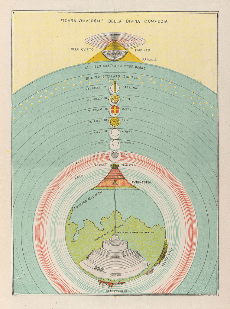 La géographie légèrement hallucinée de Socrate s’étend sur de nombreuses pages, notamment pour la partie terrestre. Elle nous rappelle les cercles de l’Enfer, du Purgatoire et du Paradis de la divine comédie de Dante, qui exposera dans les moindres détails les divers séjours des divers âmes. Normalement, le terme de monde hyper ouranien est plutôt réservé au monde des Idées décrit par le Phèdre, mais nous ne voyons pas de raison de ne pas l’utiliser ici.